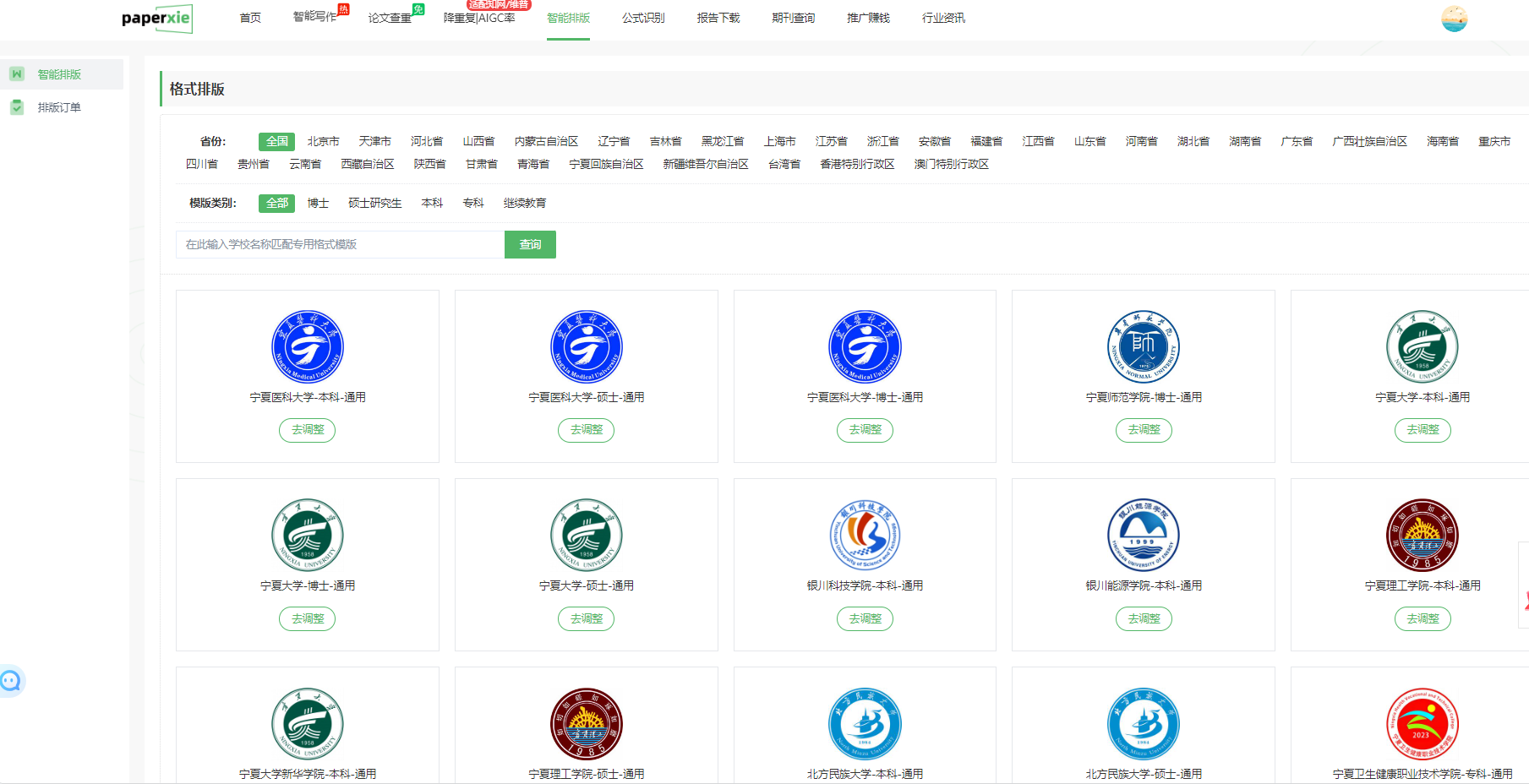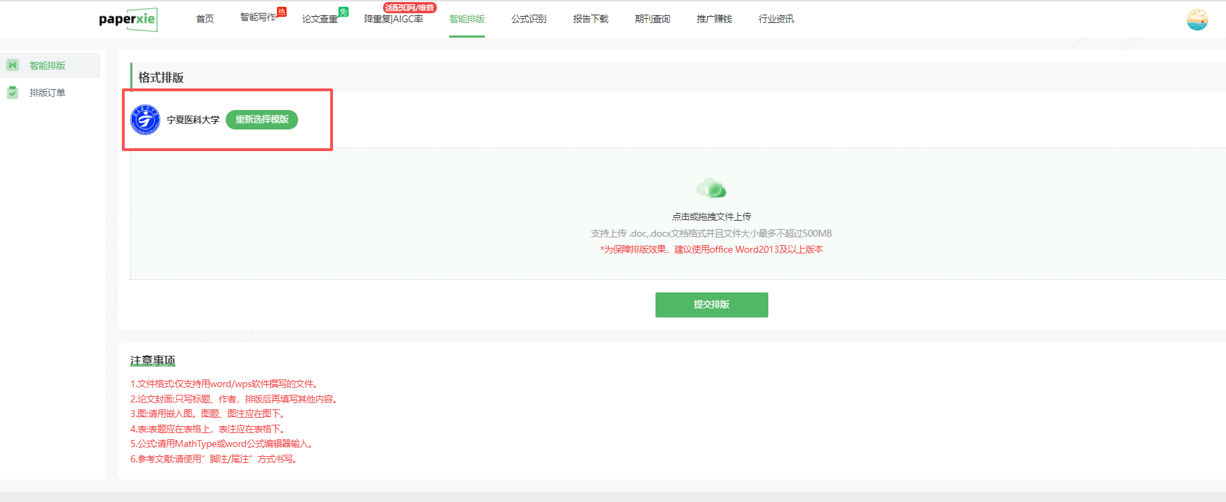 从适用场景来看,paperxie 适用于专科、本科、研究生等不同层次的学生,涵盖所有学科,能够满足毕业论文、期刊论文等多种学术场景下的写作需求。从操作流程上,首先可根据省份(如全国、北京市、上海市等)、模板类别(博士、硕士研究生、本科等)来筛选格式模板,平台提供了众多高校的专属格式模板。选定模板后,上传 doc、docx 格式且大小不超过 500MB 的论文文件(为保障排版效果,建议使用 office Word2013 及以上版本),然后提交排版,就能获得符合规范的排版成果。同时,还有注意事项需要留意,文件格式仅支持用 word/wps 软件撰写的文件;论文封面只需写标题、作者,排版后再填写其他内容;图请用嵌入图,图题、图注应在图下;表题应在表格上,表注应在表格下;公式请用 MathType 或 word 公式编辑器输入;参考文献请使用 “脚注 / 尾注” 方式书写。