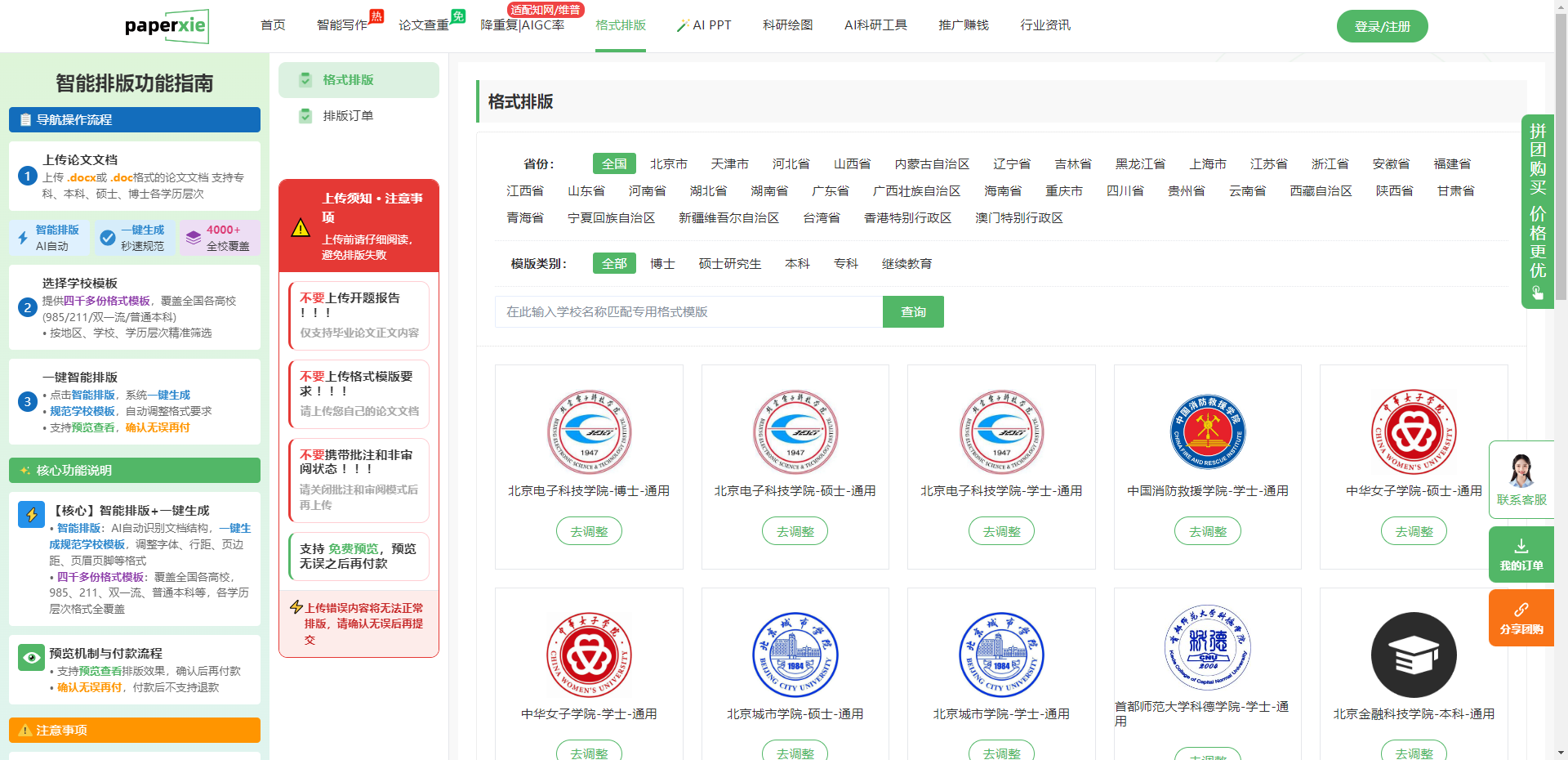 Paperxie 的模板库是其核心竞争力之一,4000 + 份模板覆盖了全国各省市的高校,包括: