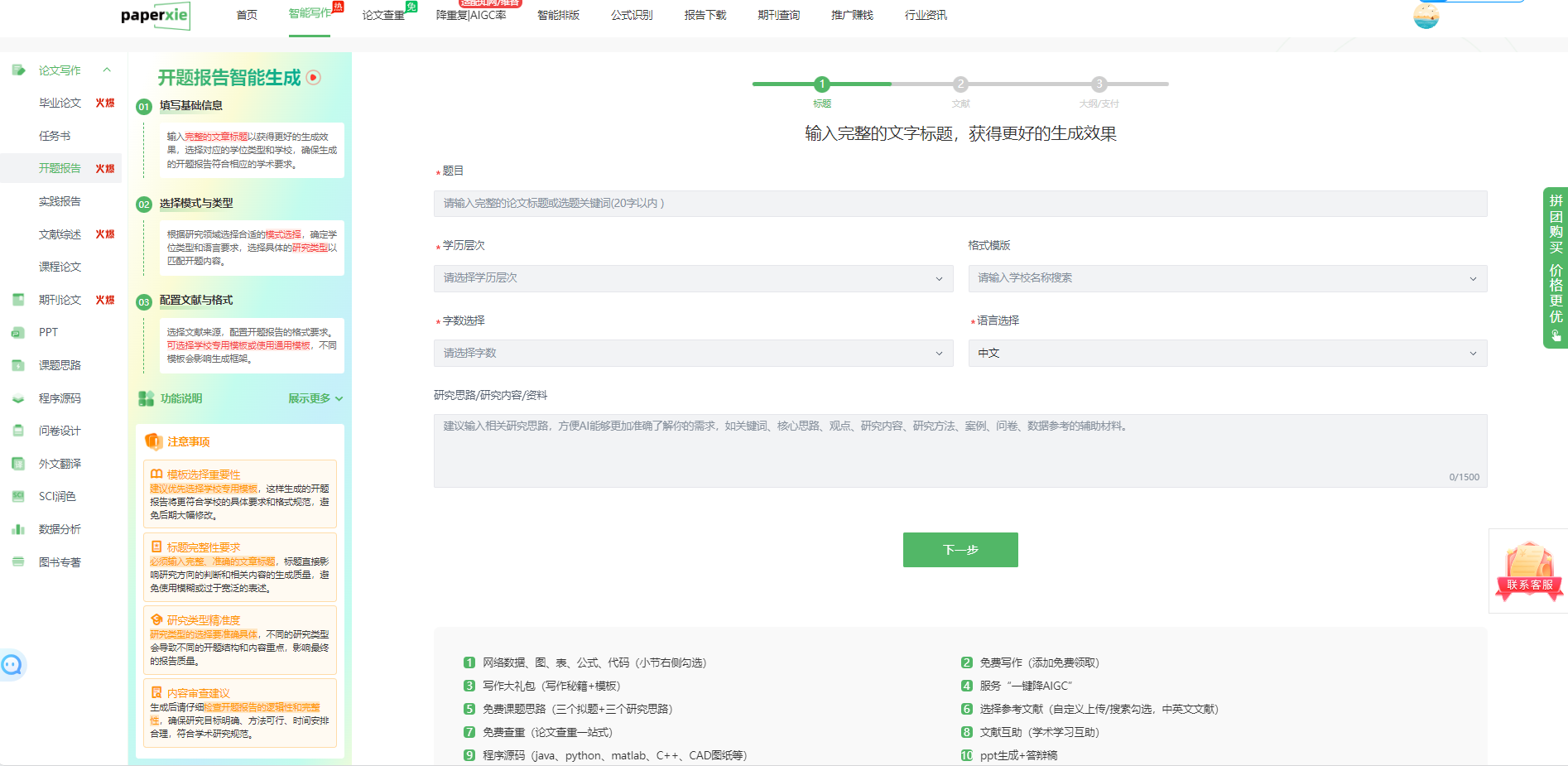 网络数据、图、表、公式、代码等元素,在很多开题报告中都是不可或缺的,PaperXie 支持这些元素的添加(小节右侧勾选),能让开题报告内容更加丰富、直观。免费写作(添加免费领取)、写作大礼包(写作秘籍 + 模板)等功能,为研究者提供了更多的写作资源与技巧,帮助他们提升写作能力。服务 “一键降 AIGC”,在当下 AIGC 广泛应用的学术环境中,能有效降低开题报告中 AIGC 的痕迹,让报告更具 “人工” 原创性。选择参考文献(自定义上传 / 搜索勾选,中英文文献)、免费课题思路(三个拟题 + 三个研究思路)等功能,从不同方面为开题报告的撰写提供支持,激发研究者的灵感,拓宽研究思路。免费查重(论文查重一站式)功能,能让研究者在完成开题报告后,及时了解重复率情况,进行针对性修改。文献互助(学术学习互助)、程序源码(java、python、matlab、C++、CAD 图纸等)、ppt 生成 + 答辩稿等功能,更是覆盖了学术创作的多个环节,为研究者提供了一站式的学术服务。