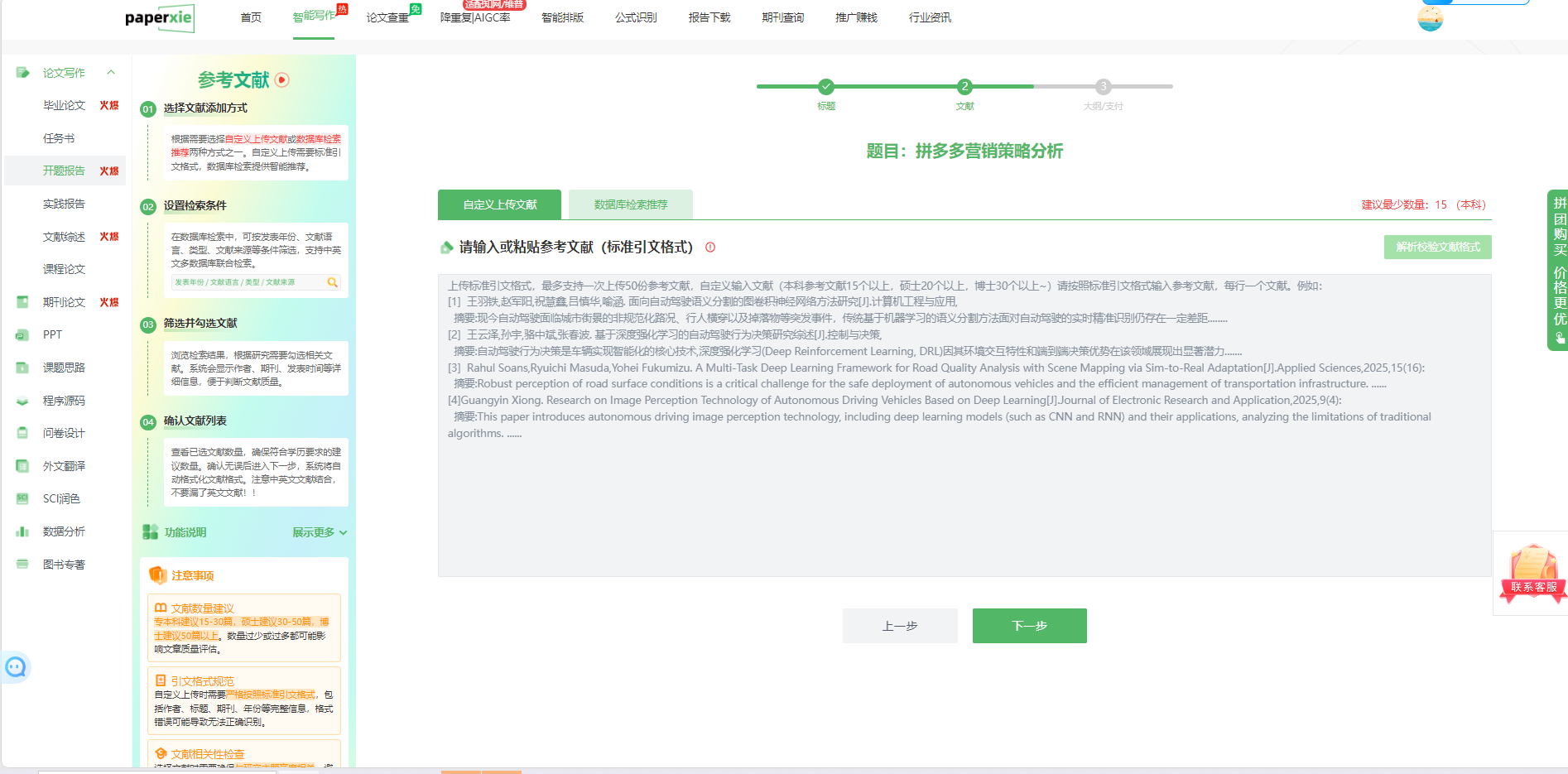 在选择文献添加方式上,用户可根据需要选择自定义上传文献或数据库检索推荐两种方式。自定义上传需要标注格式,而数据库检索则提供智能推荐,能根据研究主题快速筛选出相关的高质量文献。比如在 “拼多多营销策略分析” 的开题报告中,通过数据库检索,系统会推荐与电商营销策略、拼多多企业案例等相关的文献,大大提高了文献查找的效率与精准度。