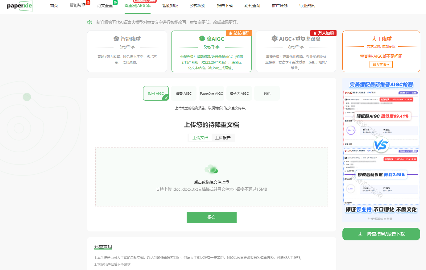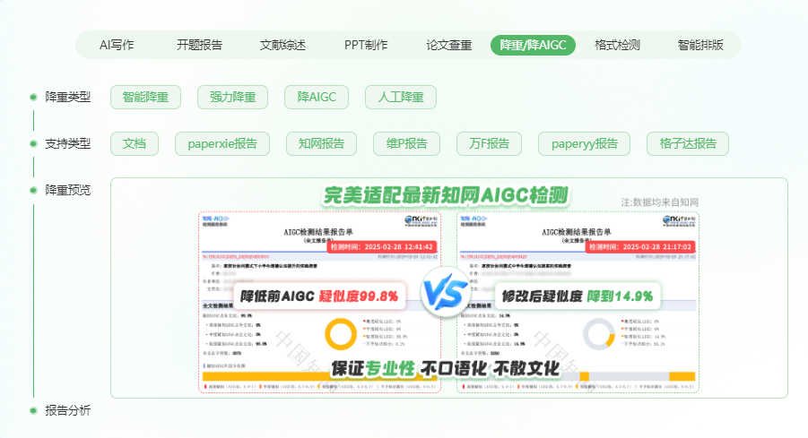 从名字就能看出,AIGCLEANER 专注于去除论文中的 AIGC 痕迹,尤其在论文学术方向的文章处理上表现出色。该工具保证能够将知网、维普、朱雀等平台检测出的 AIGC 率降低至 20% 以下,如果降不下去还会退款,官网也列举了不少成功的降重案例,用实际效果证明自身实力。