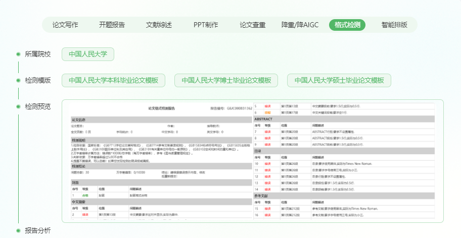 它涵盖了论文排版、智能校对、论文查重三大功能模块。能够根据学校的论文模板快速创建、编辑论文,从封面一直到参考文献,都能实现快速排版。拥有 20 余种论文排版工具,只需鼠标点击,就能一键调整格式,操作十分便捷。而且还支持在 DOC、DOCX 和 PDF 文档中直接进行审校和修改,大大提升了论文格式修改的效率。
