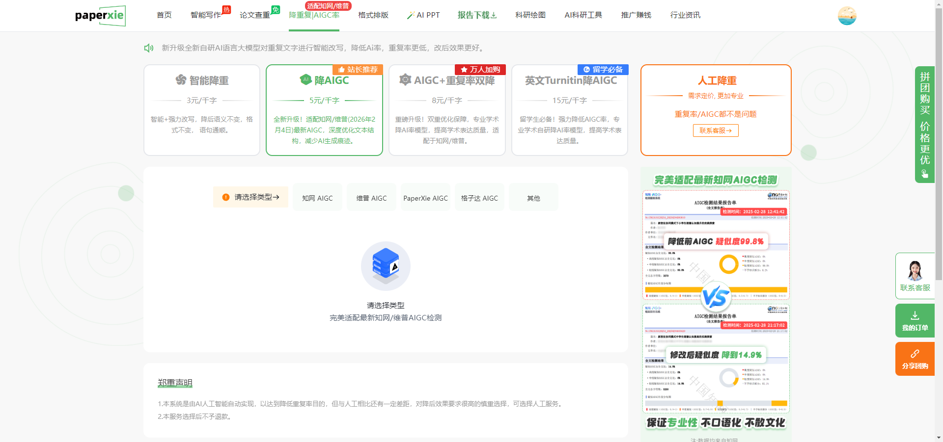 当 AI 写作成为学术创作的辅助选项,AIGC 痕迹检测便成为新的 “学术关卡”。知网、维普先后更新 AIGC 检测算法,能精准识别 AI 生成的语言特征,让不少依赖 AI 辅助的学生陷入 “写得快,过不了” 的困境。PaperXie 的降 AIGC功能,正是为破解这一难题而生,成为平台力推的 “站长推荐” 服务。
