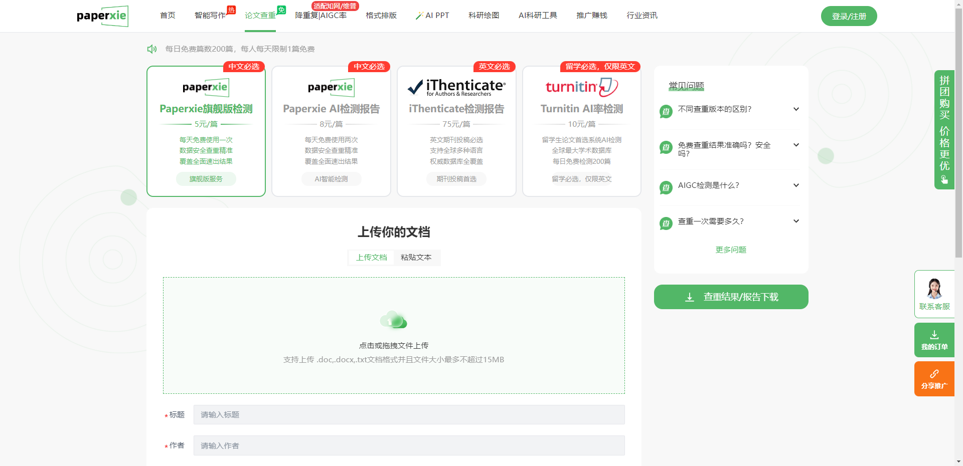 当你打开 Paperxie 的页面,不会看到眼花缭乱的广告,也不会有夸张的 “包过” 承诺,只有清晰的功能分类和简洁的操作界面。左侧是查重和降重的核心功能,右侧是常见问题解答,从 “不同查重版本的区别” 到 “查重一次需要多久”,学生关心的问题都有明确的答案,不用再到处找攻略、踩坑试错。