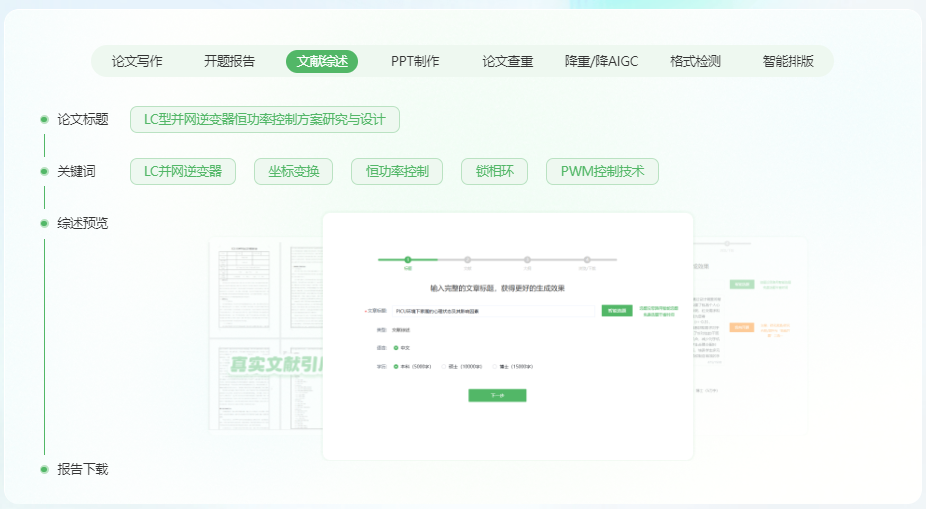 - 衍生文档:能生成开题报告、任务书、答辩PPT等配套材料且其内容跟综述高度衔接以避免“前后表述不一致”。