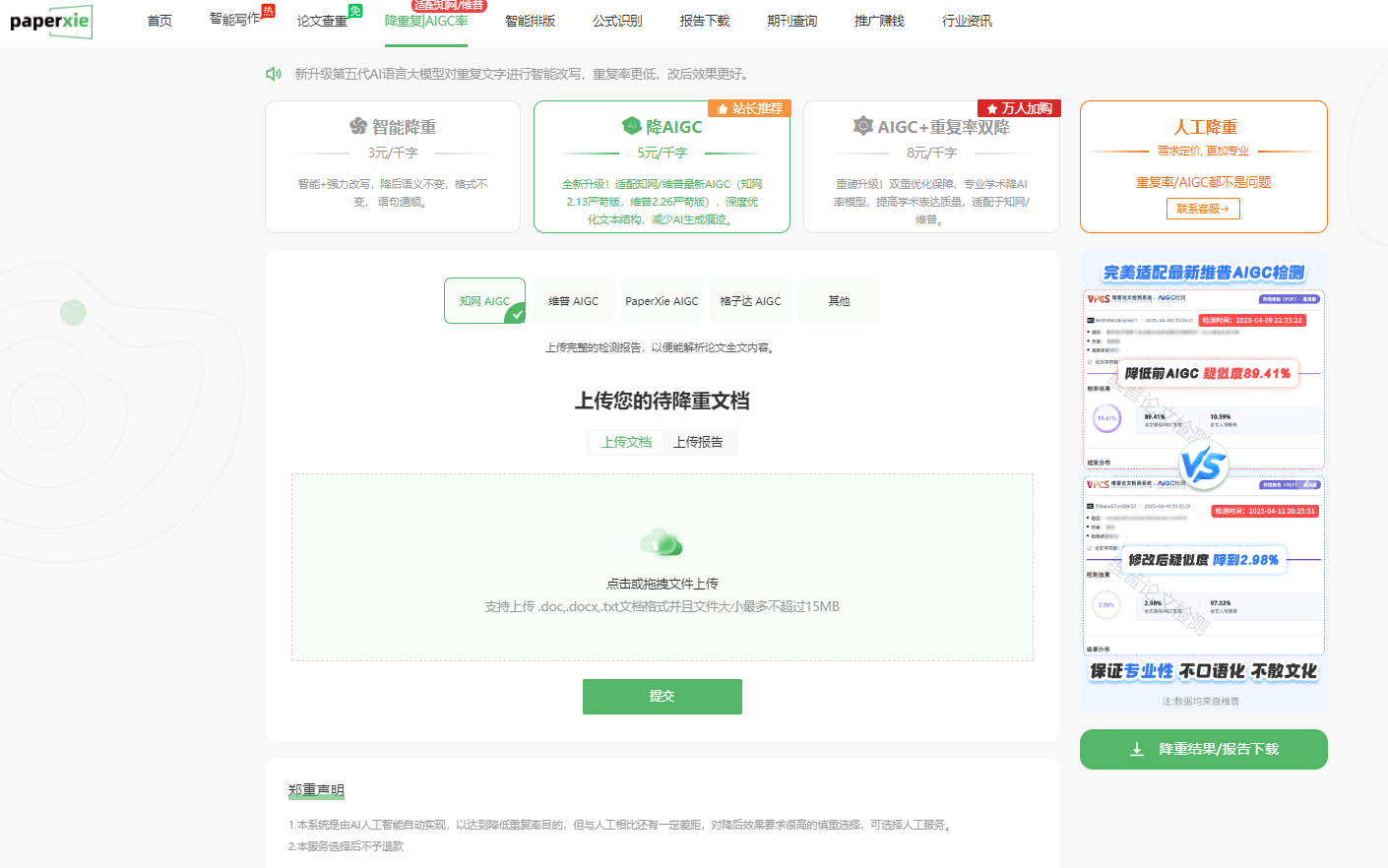 paperxie 还具备强大的降重和 AIGC 优化能力。新升级的第五代 AI 语言大模型可对重复文字进行智能改写,让重复率更低,改后效果更好。有智能降重(3 元 / 千字)、降 AIGC(5 元 / 千字,全新升级适配最新 AIGC 检测版本,深度优化文本结构,减少 AI 生成痕迹)、AIGC + 重复率双降(8 元 / 千字,双重优化保障,专业学术 AI 库模型,提升学术表达质量)以及人工降重等多种方式可供选择,能完美适配最新知网、维普 AIGC 检测,在降低重复率和 AIGC 相似度方面效果显著,同时保证专业性,不口语化、不散文化。