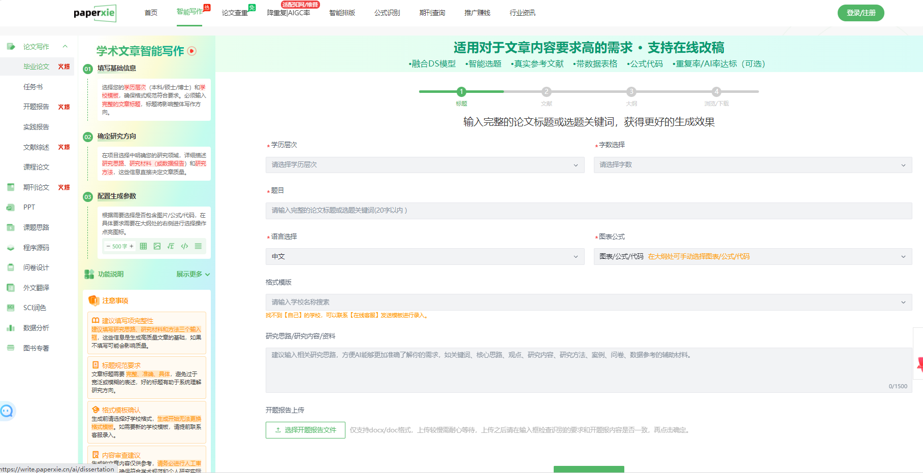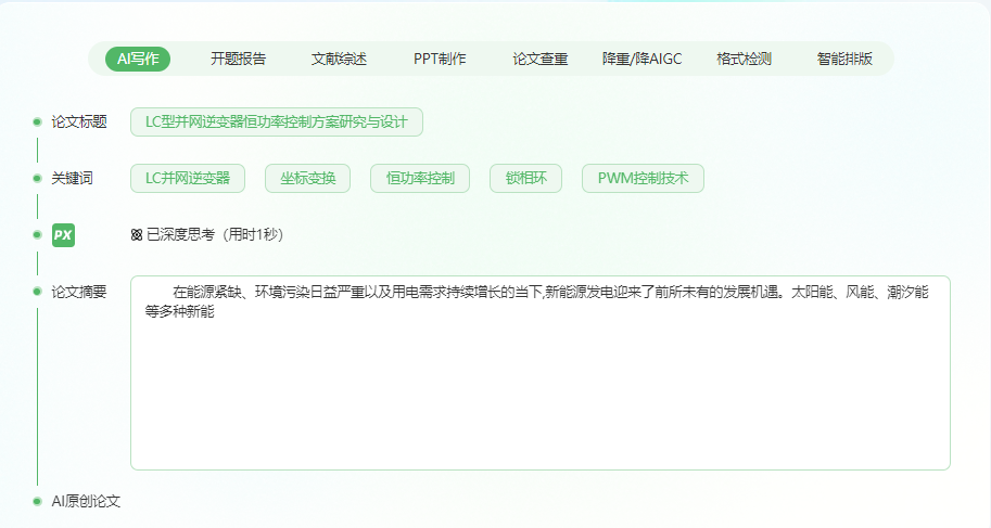 采用深度学习与自然语言处理技术,能快速领会用户的写作诉求,生成大纲与高质量论文初稿。支持产出高达 10 万字的各类论文,覆盖学科多达 700 余个,10 分钟即可完成万字学术初稿,据测试知网查重率大致在 10% 左右。服务种类多元,涵盖本专科、研究生等不同阶段的论文生成,还有文献引用、查重修改、答辩 PPT 打造等服务。