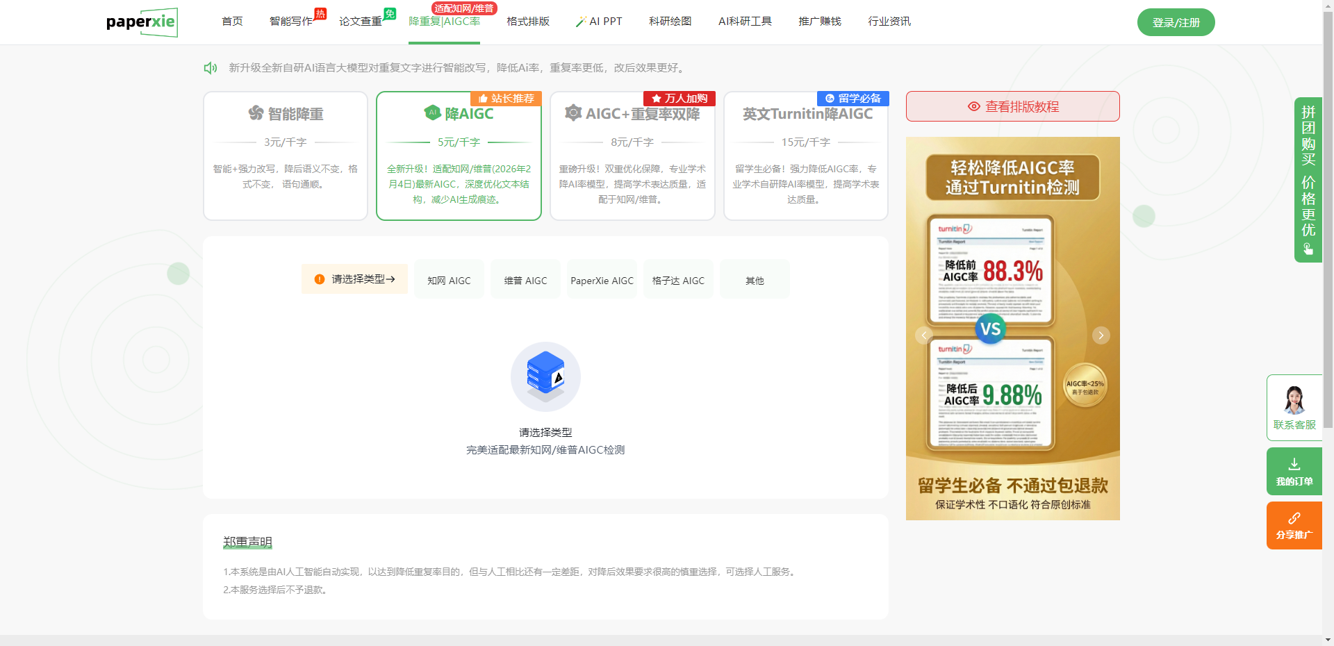 降重与降 AIGC 率功能是它的另一大亮点。智能降重服务主打 “改重不改意”,能在保留原句语义和格式的前提下优化语句,解决普通文本重复问题;站长推荐的降 AIGC 功能,专门针对知网、维普最新的 AIGC 检测优化,从平台示例来看,修改前 AIGC 疑似度 99.8% 的内容,修改后可降至 14.9%,同时保证文本的专业性,避免口语化、散文化;还有 AIGC + 重复率双降服务,一次解决两项指标问题,适合对检测标准要求较高的情况;留学生还能选择英文 Turnitin 降 AIGC 服务,适配海外院校的检测要求。