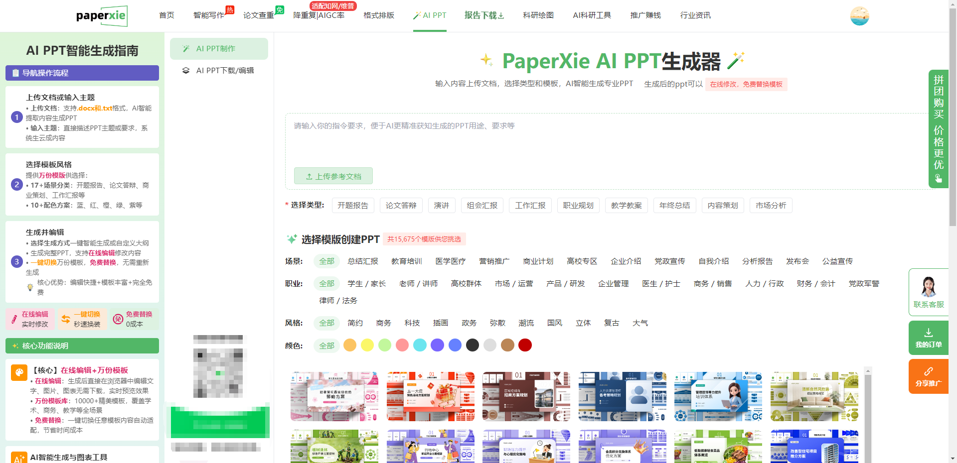 内容输入完成后,进入模板选择环节 —— 这也是 PaperXie AI PPT 最具竞争力的核心优势之一。平台共提供15675 套模板,并从场景、职业、风格、颜色四个维度进行分类筛选,让用户快速定位适配答辩的专业模板: