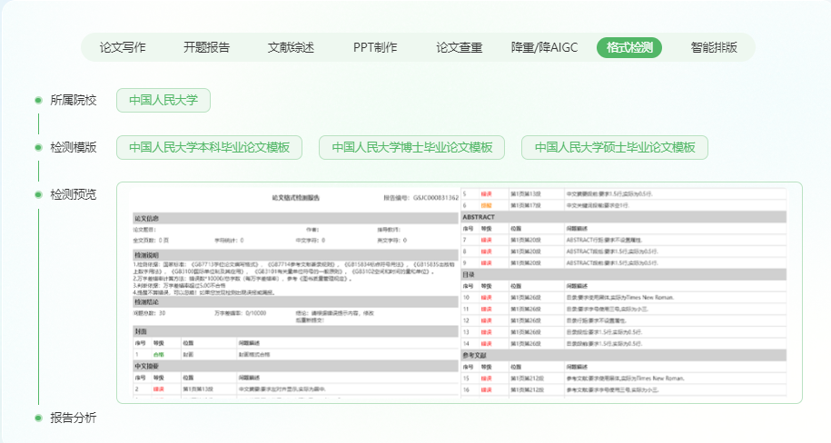 - 学科专属格式库:按文科、理科、工科、医学等 12 大学科分类搭建格式数据库,比如医学论文的图表题注置于图下、表格题注置于表上规范,工科论文的公式编号右对齐要求,文科论文的注释序号每页重新编排规则,都能精准识别并校准。