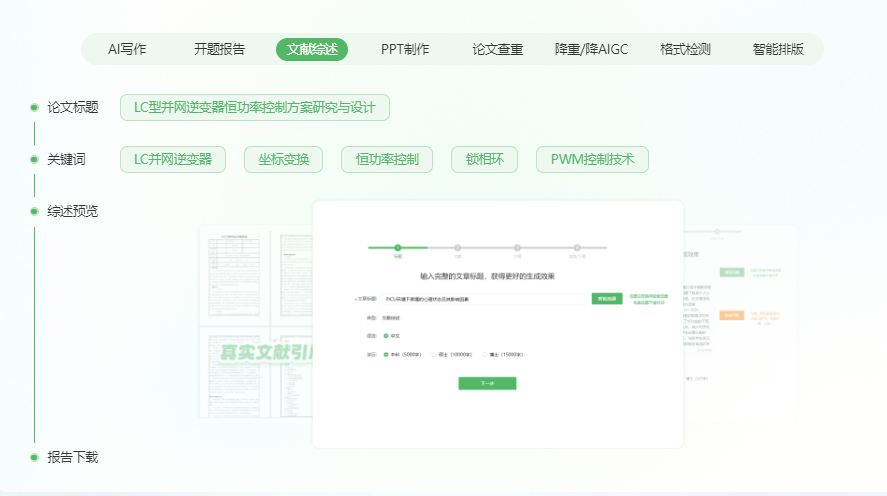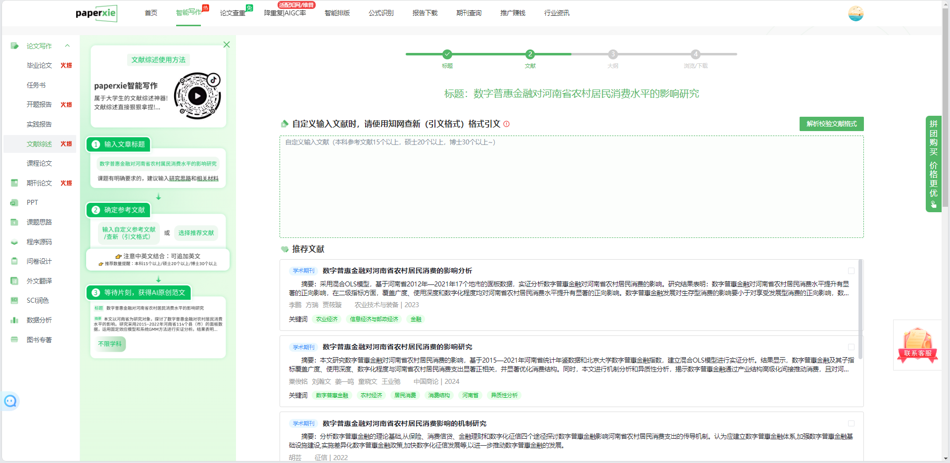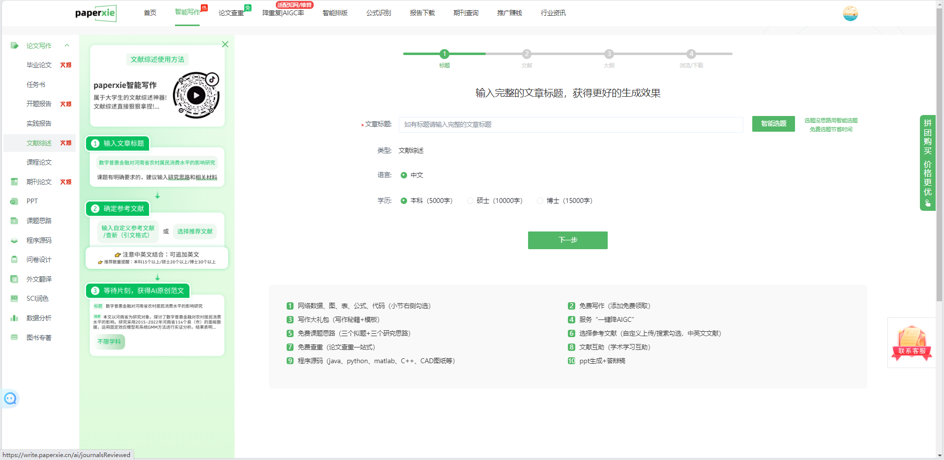 进入 PaperXie 平台,在文献综述生成板块,首先输入完整的文章标题,选择学历层次(本科、硕士、博士),点击 “下一步”;接着,输入自定义参考文献或者选择推荐文献;最后,等待片刻,即可获得 AI 原创的文献综述范文。