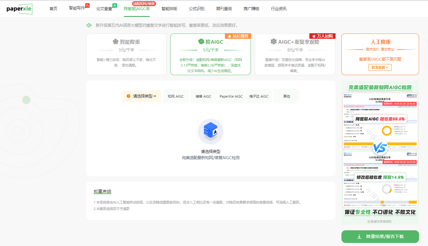 老牌检测平台升级的降 AIGC 系统,凭借高精度识别算法精准定位 AI 生成片段,通过专业词汇替换、语句语序调整、逻辑层次优化等手段降低 AIGC 占比。支持降重前后内容实时对比,方便用户核查优化细节,适配期刊论文、毕业论文等长文本降 AI 需求,检测与改写一体化效率更高。