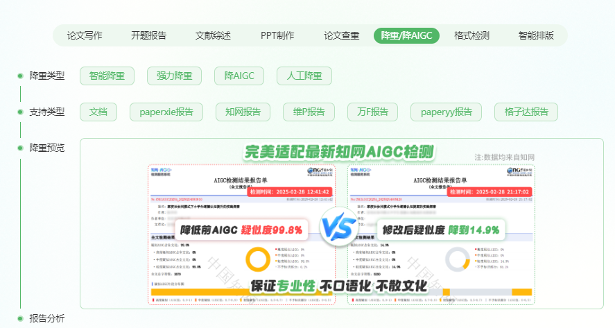 首创 “重复率 + AIGC 率” 双维度降重模式,智能引擎同步识别抄袭内容与 AI 生成痕迹,针对 AI 部分采用语义深度重构、句式灵活转换、特征词汇过滤等技术去除 AI 印记。提供实时预览功能,用户可全程监控优化效果,支持根据检测反馈二次调整,适配各类学术文本检测需求。