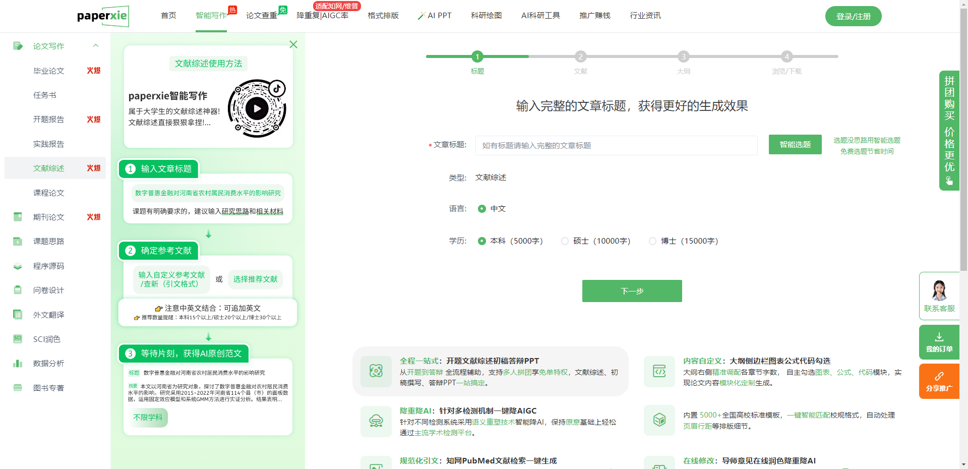 不用再为选题和找文献头疼,Paperxie AI 的操作流程简单到超乎想象。打开平台进入文献综述功能页面,只需要输入论文标题,就能开启写作之旅。如果还没确定选题,点击 “智能选题” 按钮,AI 会免费生成多个符合本科生水平、具备研究价值的选题方向,帮你直接跳过 “选题卡壳” 的阶段;要是已经有明确题目,输入完整标题后,AI 会精准匹配研究方向,为后续写作打好基础。而且平台支持全学科覆盖,文科、理科、工科、医科等专业都能适配,完全不用担心里程不符的问题。