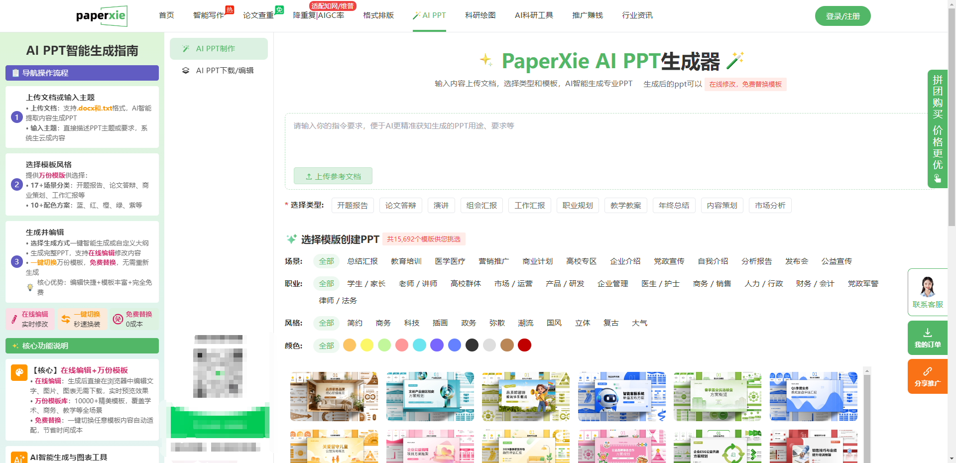 打开 PaperXie AI PPT 页面,清晰的导航操作流程就能让新手快速上手,从内容输入到模板选择再到编辑修改,三步就能完成一份专业答辩 PPT。