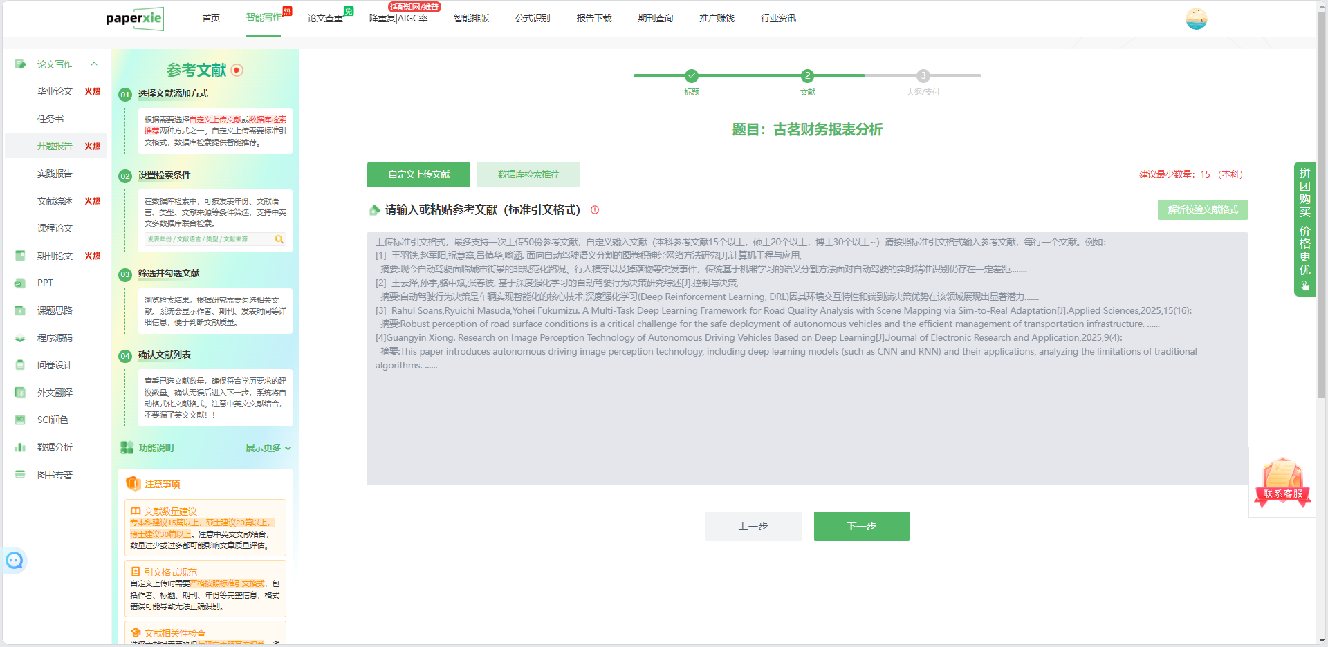 - 自定义上传:支持标准引文格式(每行一条,兼容中英文),单次最多可上传 50 条参考文献;