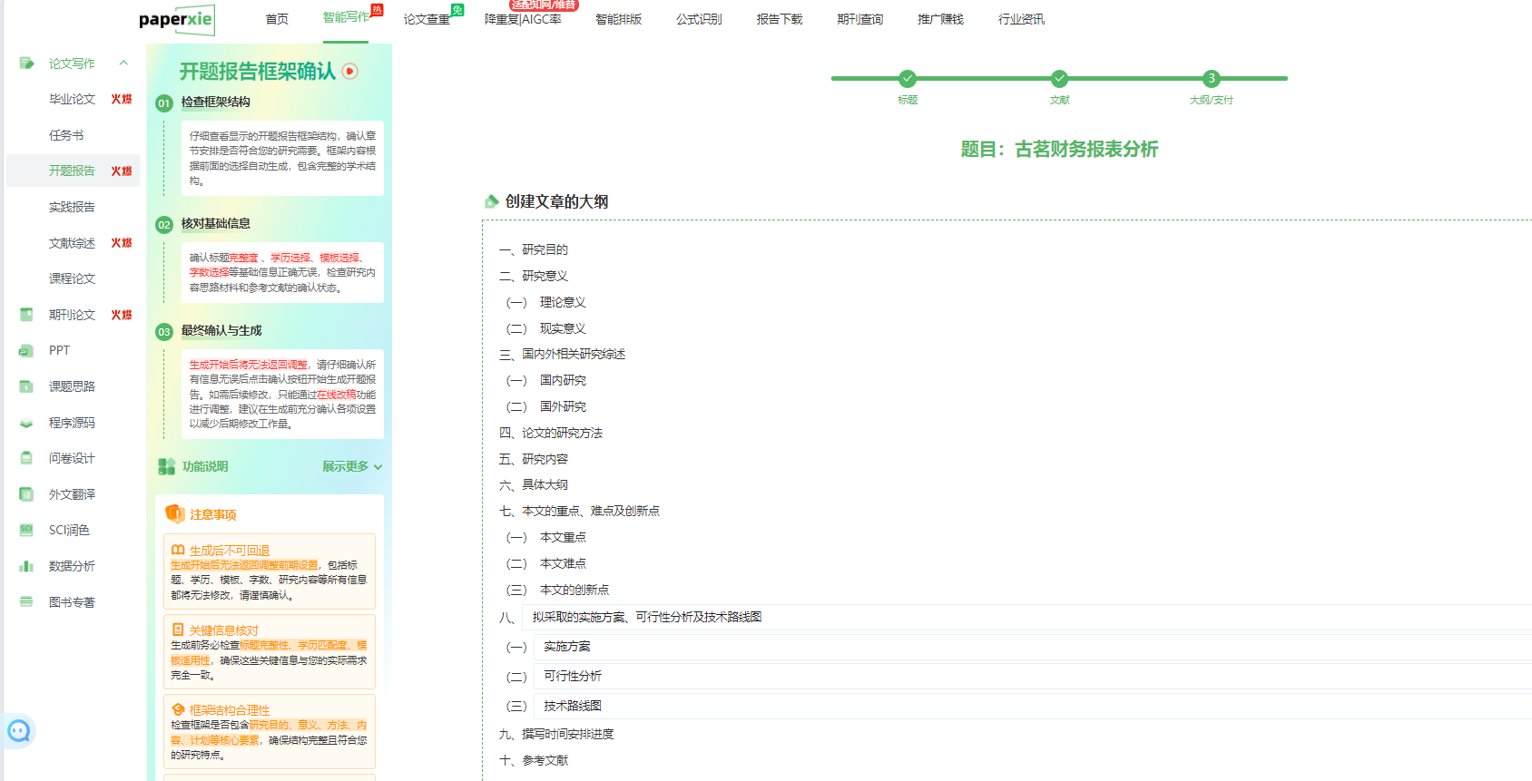 完成信息输入和文献整合后,Paperxie 会自动生成完整的开题报告框架,涵盖 “研究目的、研究意义、国内外研究综述、研究方法、技术路线图、撰写时间安排” 等核心板块。以 “古茗财务报表分析” 为例,系统生成的框架会细化到 “本文重点分析古茗与茶饮行业头部企业的财务指标差异” 等具象内容,确保学术逻辑的严谨性与研究深度。