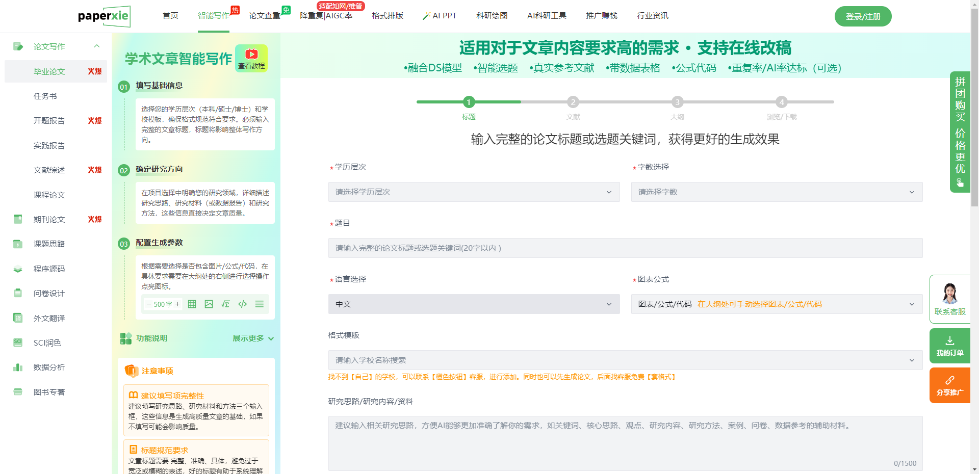 打开Paperxie AI毕业论文写作功能页面,第一眼就会被它的“引导式布局”吸引——没有复杂的菜单嵌套,没有晦涩的功能命名,整个界面按“写作全流程”拆解为三大核心区域,每一块都精准贴合本科生的操作习惯,哪怕是第一次接触AI写作工具的小白,跟着界面指引也能快速上手。(配图:Paperxie AI毕业论文写作主界面,清晰展示左侧导航栏、中间核心操作区、右侧辅助提示区)左侧导航栏一目了然,将写作类型按优先级排序,“本科毕业论文”作为高频需求,被放在最显眼的置顶位置,旁边标注“AI协作·规范可控”,下方还罗列了开题报告、文献综述等细分模块,覆盖毕业论文写作的全生命周期;中间是核心操作区,以“三步式流程”为核心,从“基础信息配置”“研究方向确定”到“参数定制生成”,每一步都有清晰的输入框和提示文字,红色星号标注必填项,避免遗漏关键信息;右侧是辅助提示区,实时展示当前步骤的操作指南、注意事项,还有“拼团优惠”提示和客服入口,遇到问题能快速求助,同时标注“AI辅助创作,需结合个人思考优化”,引导规范使用AI,规避学术风险。整个界面没有多余的装饰,逻辑清晰、重点突出,完美契合本科生“从不知道写什么,到知道怎么写”的认知过程,彻底打破“AI工具操作复杂”的刻板印象。