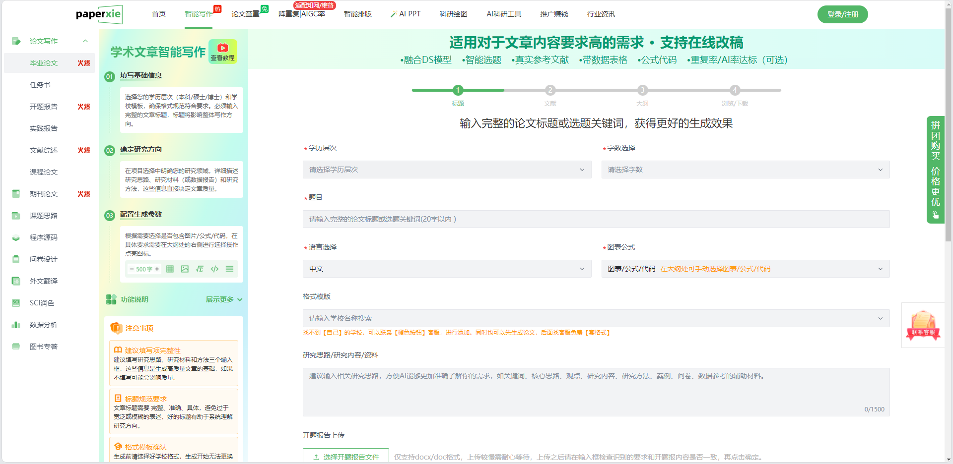 基础信息模块围绕本科需求设计,选择 “本科” 学历、匹配对应字数,输入 20 字内的论文标题或关键词即可定位研究方向,无思路还能借助智能选题功能获取推荐。语言默认适配中文,理工科学生可提前勾选 “图表 / 公式 / 代码” 选项,系统会自动匹配专业内容。同时,输入学校名称就能搜索专属格式模板,无对应模板可联系客服免费添加,成稿后还能享受免费套格式服务。