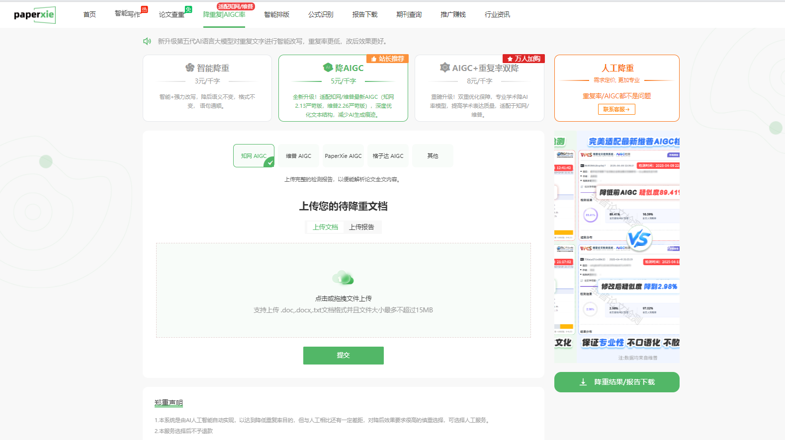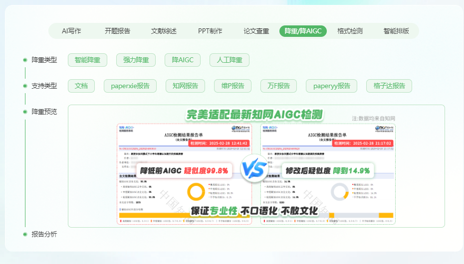 它全新升级的第五代 AI 语言大模型,能对重复及 AI 生成文字进行智能改写。比如适配知网 2.13 严苛版、维普 2.26 严判版的降 AIGC 服务,深度优化文本结构,减少 AI 生成痕迹,像示例中能把 AIGC 疑似度从 99.8% 降到 14.9%,专业度拉满且绝不口语化、散文化。同时还有AIGC + 重复率双降服务,双重优化保障,提升学术表达质量,适配知网、维普毫无压力。