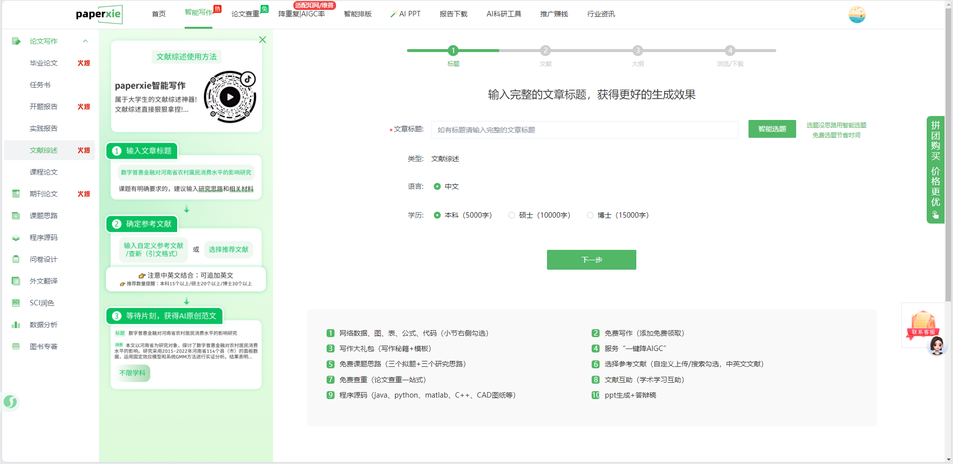 在 paperxie 的文献综述功能页,第一步就是「输入文章标题」,系统会提示「如有标题请输入完整的文章标题,获得更好的生成效果」。我直接输入了案例标题《数字普惠金融对河南省农村居民消费水平的影响研究》,同时选择了「本科(5000 字)」的学历维度 —— 这一步的关键是「让工具明确你的研究范围和深度需求」,避免生成内容过于泛化或超出学业要求。
