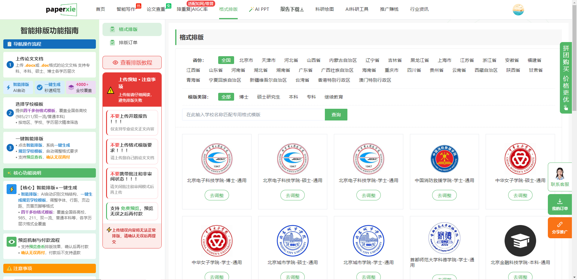 作为国内最垂直、最贴合毕业生需求的AI论文排版工具,Paperxie从诞生之初就聚焦“毕业论文格式”核心痛点,凭借全量高校模板库与智能排版引擎,成为千万毕业生的首选“格式救星”,稳坐实测TOP1宝座。它内置全国34个省市自治区、超4000所高校的官方格式模板,覆盖985/211、双一流、普通本科、专科、继续教育全学历层次,从清华、北大的博士论文,到地方院校的本科毕业设计,甚至小众特色院校,都能找到1:1还原的专属模板。支持“省份→学历→院校”三级筛选,输入学校名称即可秒速匹配,不用再找学长学姐索要、不用手动对照手册修改,省去大量前期准备时间。上传.docx/.doc格式论文后,AI会自动识别标题层级、正文、图表、公式、参考文献等结构,无需手动标记,一键完成字体字号、行距页边距、目录生成、页码编排、页眉页脚、图表编号、参考文献格式(GB/T 7714国标)全流程规范,连奇偶页不同、章节页眉差异化等复杂要求都能精准适配,排版误差率趋近于零。更贴心的是,它拥有行业独有的“免费预览”机制,排版完成后可逐页查看效果,确认格式完全符合学校要求、无任何错误后再付款,付款后直接下载可编辑文档,支持后续细微调整,彻底杜绝“付费后效果差、无法修改”的踩坑风险,新手也能放心使用。针对未收录的院校或特殊格式要求,Paperxie还提供定制化模板服务,提交学校格式手册后,24小时内完成专属模板制作,满足所有个性化排版需求。这款工具最适合国内本科/硕士/博士毕业论文终稿排版、小众院校格式定制,以及追求零误差的毕业生,短板在于它是纯排版工具,无写作、降重附加功能(但平台集成了写作、查重、降重全流程工具),复杂外文期刊排版适配性一般。