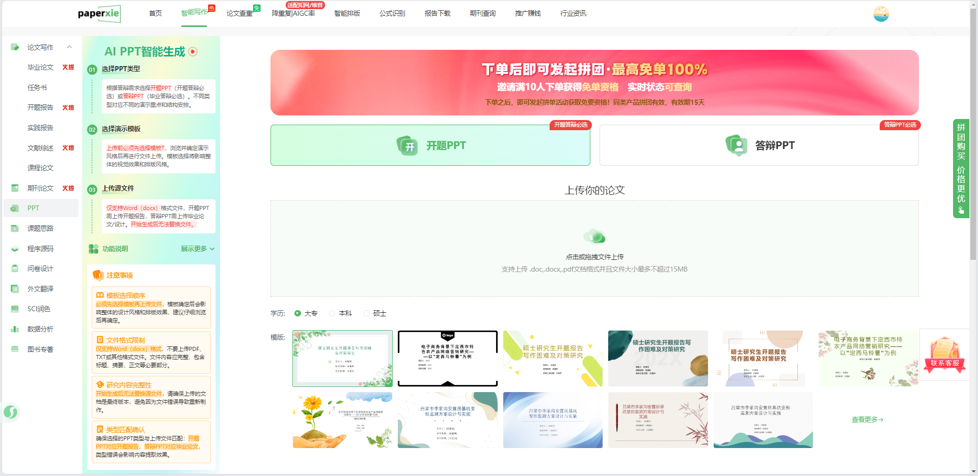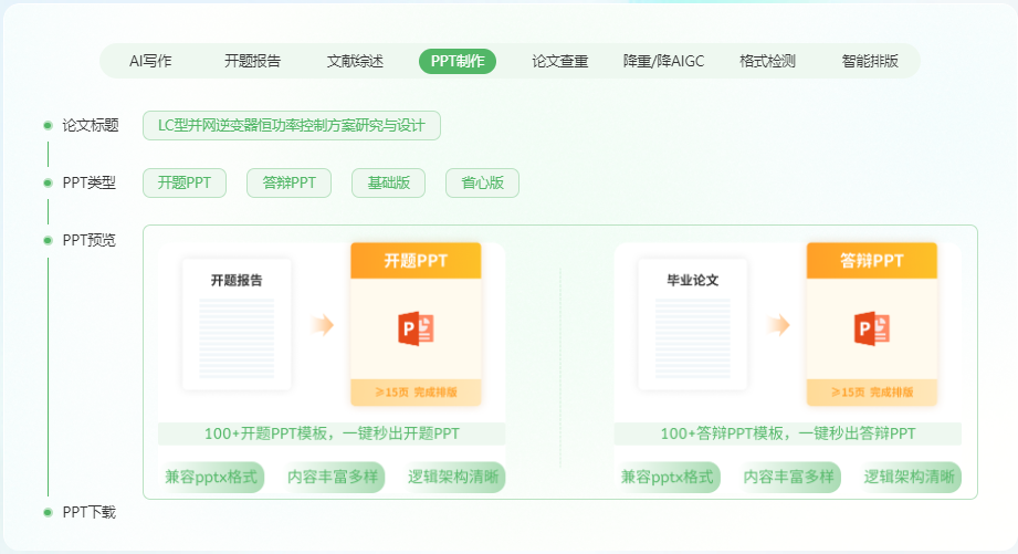 - 效率至上:无需手动排版、调整逻辑,上传文件后即可快速生成 PPT,节省大量时间用于内容打磨和答辩演练。