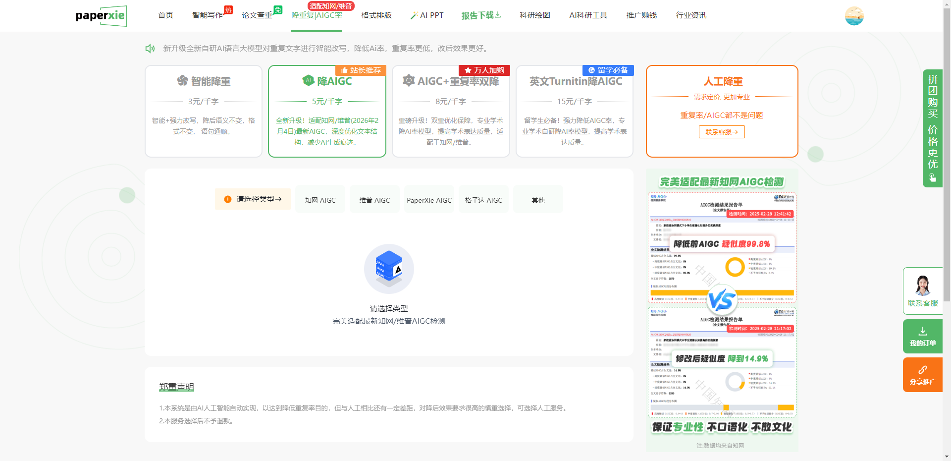 作为本次盘点的核心工具,PaperXie 凭借「四大功能板块 + 学术场景深度适配」,成为应对 2026 年最新学术检测的首选。打开官网「降重复 | AIGC 率」板块,就能看到针对不同需求的差异化服务: