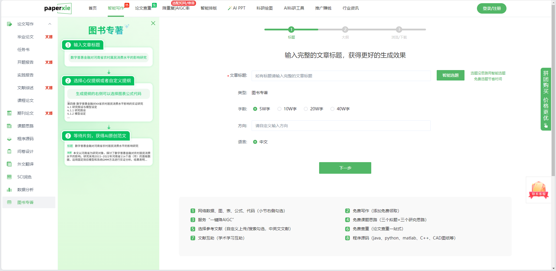 左侧以绿色模块展示 “输入标题→选择提纲→获取范文” 三大核心步骤,直观呈现创作全流程。输入完整标题可锁定研究方向,为后续创作奠基;支持智能生成提纲与自定义提纲,还可按需添加图表、公式、代码,适配不同专业专著的创作需求;依托 AI 技术,短时间即可生成原创范文,解决内容填充难题。