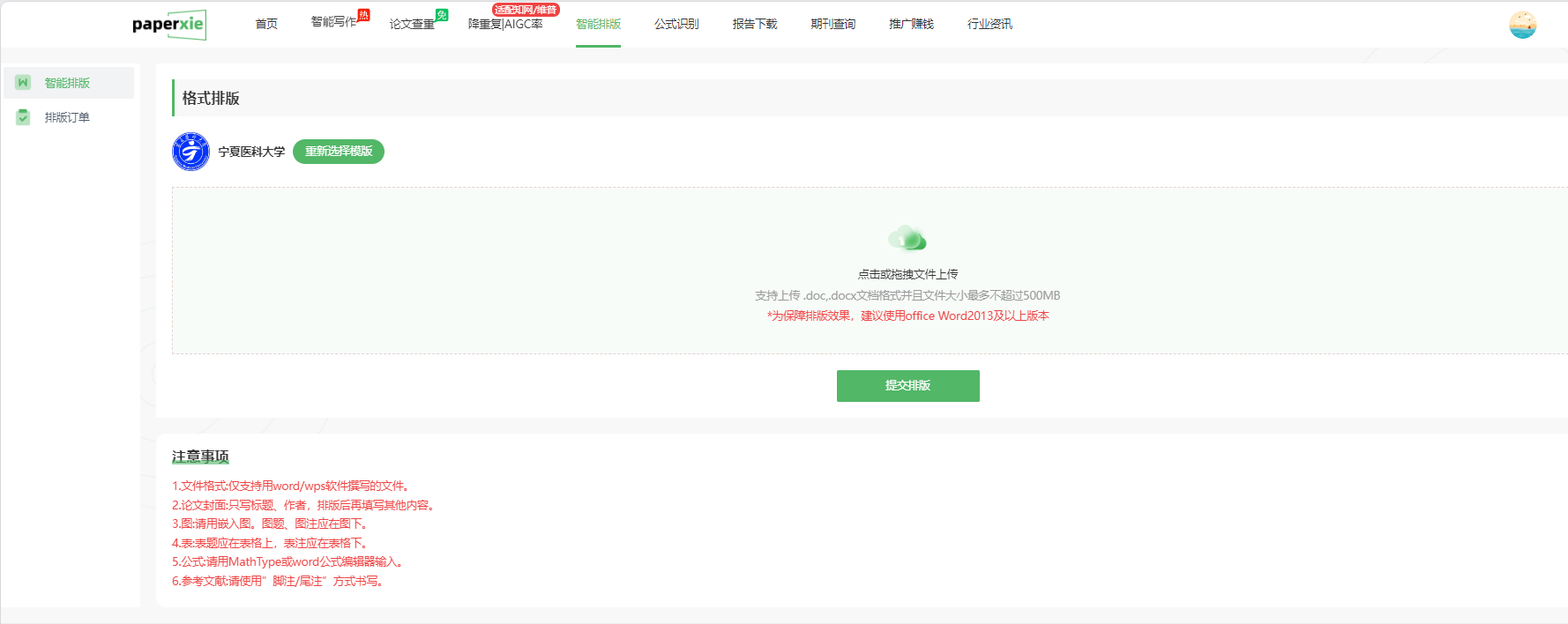 操作流程十分简单:首先在 “智能排版” 板块选择所在省份、学历层次(模板类别),也可直接输入学校名称精准匹配专用格式模板;然后上传论文文档(支持.doc、.docx 格式,大小不超过 500MB,建议使用 Office Word2013 及以上版本);最后点击 “提交排版”,系统就会自动按照所选模板完成格式优化,涵盖封面、页眉页脚、字体字号、段落间距、参考文献格式等所有细节。