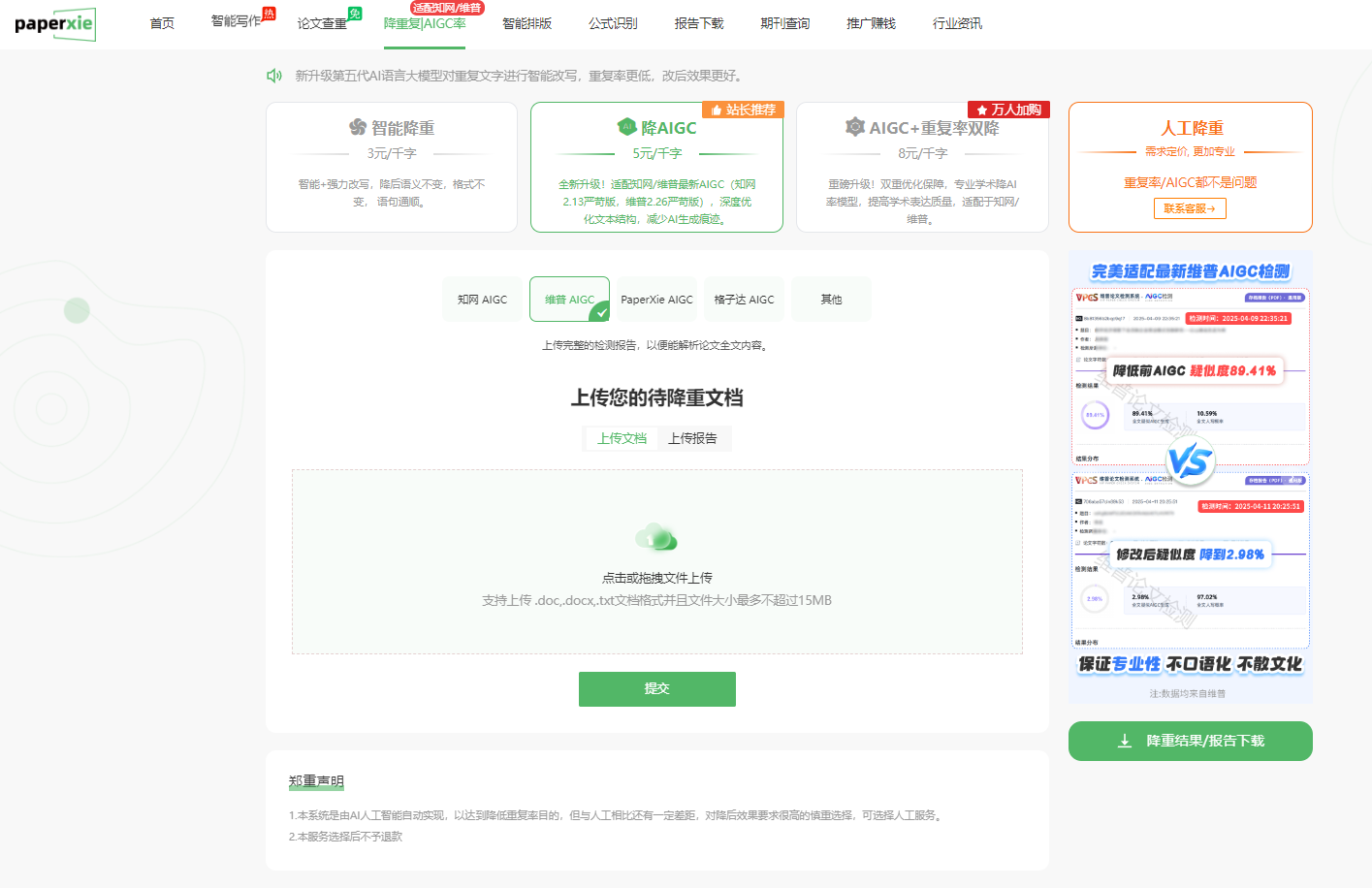 CheckVIP 平台提供查重、降重、AIGC 免费降重等一体化服务。其基于学术语料库的模型,降重降 AI 效果较为专业,但建议开启 “强力降重” 功能,这样能获得更好的效果,否则可能达不到预期。