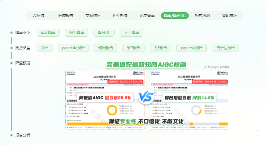 PaperXie 是一款集多种实用功能于一体的工具,在降低 AIGC 率方面表现出色。它依托先进的智能算法,可从词汇、语法、语义等多个维度对文章进行深度处理。能精准识别 AI 生成内容的典型特征,通过调整词汇选择、优化文风等方式,有效减少 AI 生成内容的可识别度。支持上传 AIGC 检测报告或论文原文,系统会自动识别并处理相关内容,降重降 AI 后的结果可通过知网、维普等权威查重平台检测。而且,它还提供免费的 AI 改稿服务,能快速生成论文初稿,若 AIGC 率超过 25%、重复率超过 15%,还会进行退费,保障用户权益。从提供的图片也能看到,PaperXie 有专门的降 AIGC 功能板块,且展示了适配知网 AIGC 检测的前后效果对比,修改前 AIGC 疑似度高达 99.8%,修改后能降到 14.9%,效果显著。