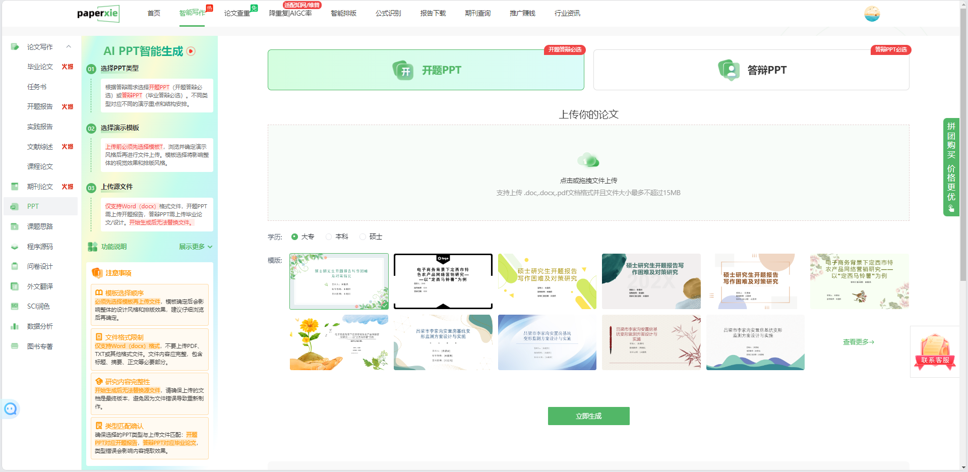 生成开题答辩 PPT 时,学术云端 AI 写作助手会依据开题报告的章节结构和重点内容,生成对应的 PPT 页面。它会把复杂的研究内容转化为简洁直观的图表和文字,方便评委理解。同时,还会提供一些动画效果和转场特效的建议,让 PPT 的展示更加生动有趣,吸引评委的注意力,更好地展现研究的价值与潜力。