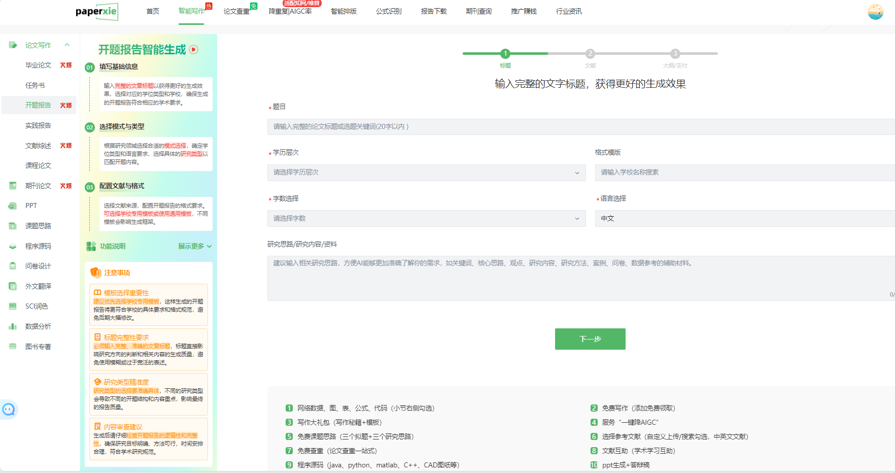 在学术研究的漫漫征程中,开题报告是至关重要的第一步,它犹如一座桥梁,连接着研究者的初步构想与后续深入的学术探索。然而,撰写开题报告往往是一个繁琐且极具挑战的过程,从确定选题、梳理研究思路到规范格式、筛选文献等,每一个环节都需要耗费大量的时间和精力。幸运的是,PaperXie 平台凭借其强大的功能,为广大学子和研究者们提供了高效完成开题报告的有力支持,让学术起步变得更加轻松顺畅。