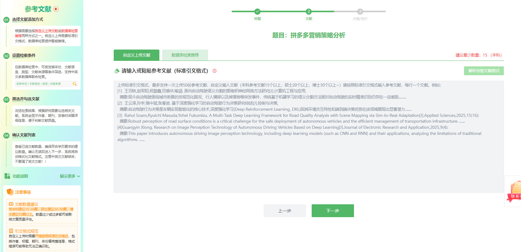 在参考文献环节,PaperXie 提供了自定义上传文献和数据库检索推荐两种灵活的添加方式。自定义上传需要标注引文格式,适合用户已有明确的文献来源,且能确保文献的针对性和独特性。而数据库检索推荐则借助平台强大的数据库资源,为用户智能推荐相关文献,拓宽了文献获取的渠道,让用户能接触到更广泛的学术研究成果。
