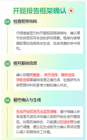 生成开始后便无法返回调整,因此要仔细确认所有信息无误后点击确认按钮开始生成开题报告。如果后续需要修改,只能通过在线改稿功能进行调整,建议在生成前充分确认各项设置以减少后期修改工作量。这一步需要用户保持高度的谨慎,因为它关系到最终开题报告的质量和后续的修改成本。