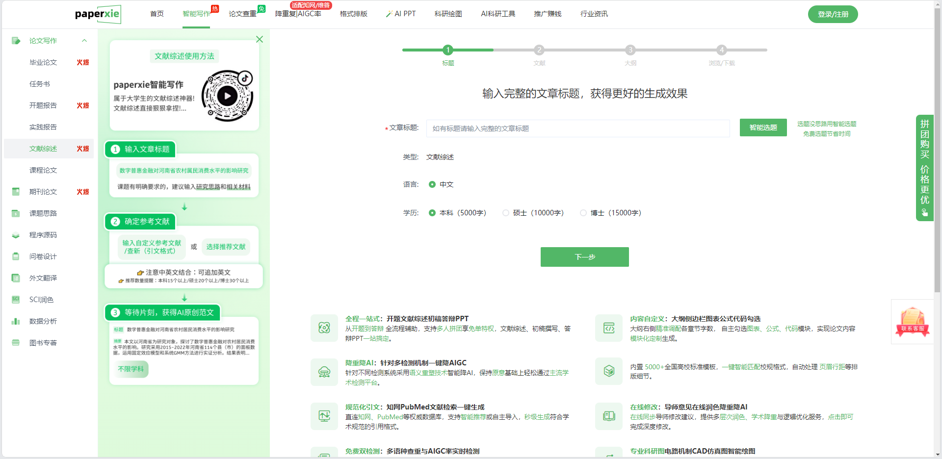 - 文章标题:输入完整、具体的文献综述标题(如 “数字普惠金融对河南省农村居民消费水平的影响研究”),标题将直接影响 AI 生成内容的精准度。