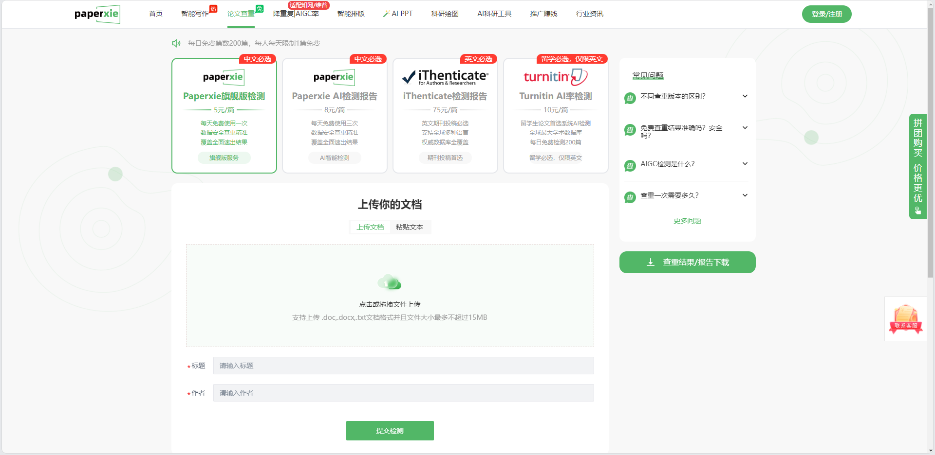 在版本适配方面,paperxie 针对不同学术场景推出专属检测版本,实现精准匹配:旗舰版检测作为中文论文首选,5 元 / 篇且每日免费 1 次,依托全面中文数据库,适配国内绝大多数论文检测;AI 检测报告专为 AI 生成内容设计,8 元 / 篇每日免费 3 次,精准识别 AI 痕迹,规避学术不端风险;iThenticate 检测报告面向英文期刊投稿,75 元 / 篇,覆盖全球多语言学术资源;Turnitin AI 率检测是留学生专属,仅支持英文,10 元 / 篇且每日免费 200 篇,贴合海外高校审核标准。多版本设计让学子按需选择,避免为无用功能付费。