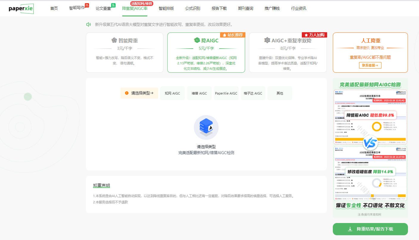 对于那些对处理效果要求高,想要快速把论文重复率和 AIGC 率降到较低水平,还需要针对不同查重平台进行个性化处理的小伙伴来说,芝士 AI 是理想之选。比如要投不同的期刊,对查重平台有不同要求,用它就很合适。