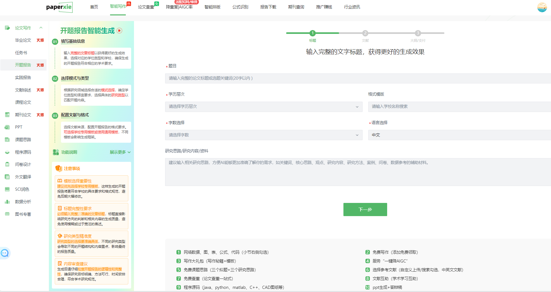 paperxie 是基于 AI 技术的写作平台,能助力学者快速生成各类学术内容,开题报告也不在话下。从图片可以看到,它的开题报告智能生成流程十分清晰,首先填写基础信息,输入完整文章标题能获得更好生成效果,还可选择学位类型和学校,确保生成的开题报告符合学术要求;接着选择模式与类型,根据研究领域选合适模式,确定学位类型、语言要求和具体研究类型来匹配开题内容;最后配置文献与格式,选择文献来源,还能选学校专用模板或通用模板,不同模板会影响生成框架。